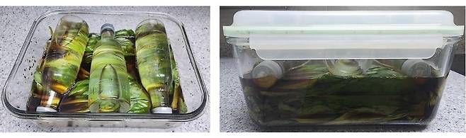 | ▲ 하루 지난 명이나물 장아찌 패트병에 물을 채워 누름틀로 하나를 더 넣어주어 명이나물이 간장에 잠기게 했다. |