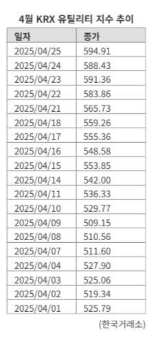 27일 한국거래소에 따르면 지난 2~25일 전체 KRX 지수 가운데 가장 높은 수익률을 거둔 지수는 'KRX 유틸리티 지수'로 이달 들어 15.00% 상승했다. 코스피, 코스닥 지수의 이달 상승률이 2.63%, 8.45% 수준이었던 것과 비교해 두 배 이상 급등했다.