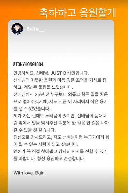27일 배인은 홍석천에게 "안녕하세요 선배님, JUST B배인입니다"라며 "선배님의 따뜻한 응원과 마음 깊은 조언을 기사로 접하고 정말 큰 울림을 느꼈습니다"라는 메세지를 전했다.