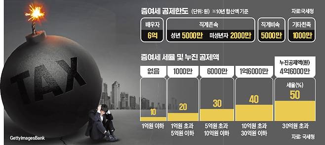 부모에게 15억원짜리 아파트를 증여받은 성인 직계존속 자녀는 공제액(5000만원)을 제외한 14억5000만원이 과세표준이다. 과세표준 10억원 초과~15억원 이하 세율은 40%다. 14억5000만원에 40%를 곱한 뒤 해당 구간의 누진 공제액(1억6000만원)을 빼 산출한 최종 납부 증여세는 4억2000만원이다.