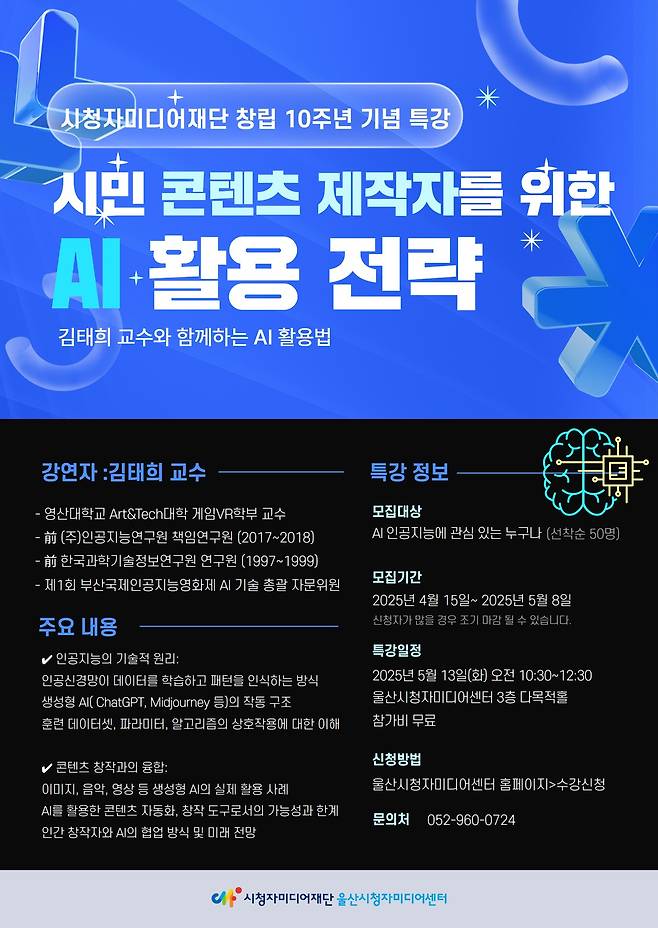시청자미디어재단 창립 10주년을 기념해 울산시청자미디어센터(센터장 오원태)가 오는 5월13일 오전 10시30분 3층 다목적홀에서 특강 ‘시민 콘텐츠 제작자를 위한 AI 활용 전략’을 개최한다.
