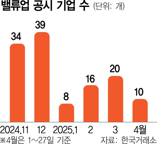 27일 한국거래소에 따르면 이달 밸류업 공시(예고 포함)를 한 기업 수는 10개사로 제도 시행 초기였던 올해 1월(8개사) 이후 최저 수준을 기록했다. 이마저도 두 번째 밸류업 공시를 내놓은 KB금융·신한지주·에스트래픽을 제외하면 7곳이다. 올해 2월(16개사)과 3월(20개사) 대비 눈에 띄게 줄었을 뿐만 아니라 지난해 12월(39개사)과 비교하면 급감한 셈이다.