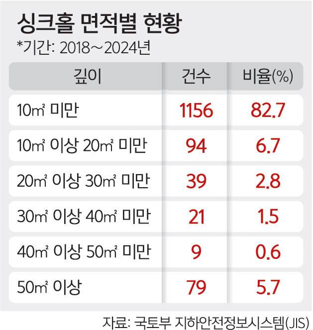 27일 국토교통부의 ‘지하안전정보시스템(JIS)’에 등록된 2018∼2024년 지반침하사고 1398건을 분석한 결과 이같이 나타났다. JIS는 지하안전법 등 관련 법령에 따라 면적 1㎡ 이상 또는 깊이 1m 이상이거나, 사상자 또는 실종자가 발생한 싱크홀을 집계하고 있다.