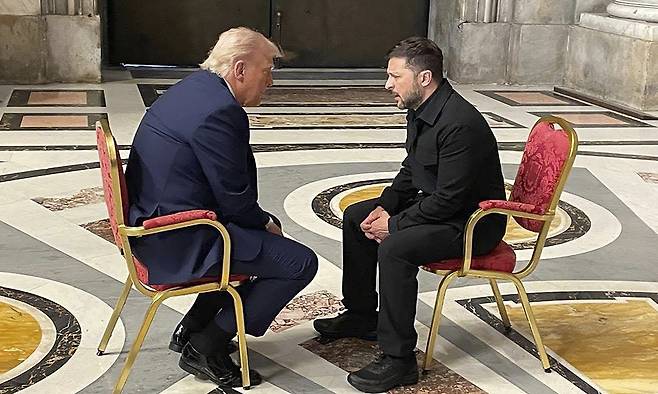 | 바티칸서 만난 트럼프·젤렌스키 도널드 트럼프 미국 대통령(왼쪽)과 볼로디미르 젤렌스키 우크라이나 대통령이 26일(현지시간) 바티칸 성베드로 광장에서 열린 프란치스코 교황의 장례미사에 앞서 독대해 이야기를 나누고 있다. 이들은 지난 2월 말 백악관에서 공개 설전을 벌인 이후 처음 만났다. 바티칸=EPA연합뉴스 |