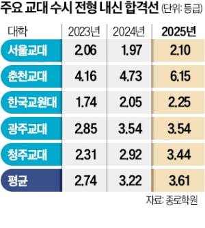 27일 종로학원에 따르면 서울교대 춘천교대 한국교원대 광주교대 청주교대 등 주요 5개 교대의 2025학년도 수시전형 내신 합격선은 3.61등급으로 집계됐다. 2023학년도 2.74등급, 2024학년도 3.22등급 등 지속적으로 하락세를 보이고 있다.