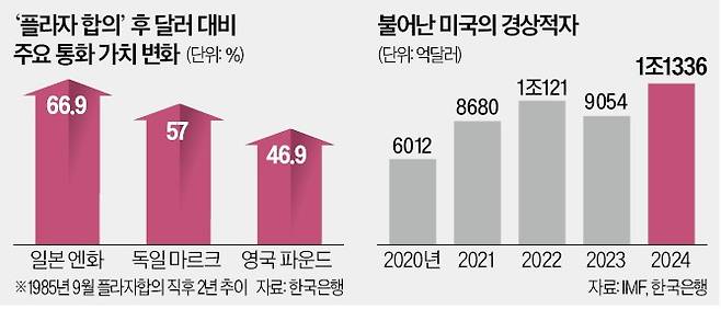 한·미 간 통상 협의의 주요 의제에 ‘환율 정책’이 포함돼 당국과 시장이 긴장하고 있다. 고질적인 무역적자에 시달리는 미국이 관세 다음 단계로 무역상대국에 통화 절상 압박을 본격화하는 게 아니냐는 우려에서다. 달러 대비 엔화 가치를 높여 일본의 수출·제조업 경쟁력을 약화한 1985년 ‘플라자 합의’의 악몽이 한국에서도 재연되는 게 아니냐는 비관적 전망까지 나온다.