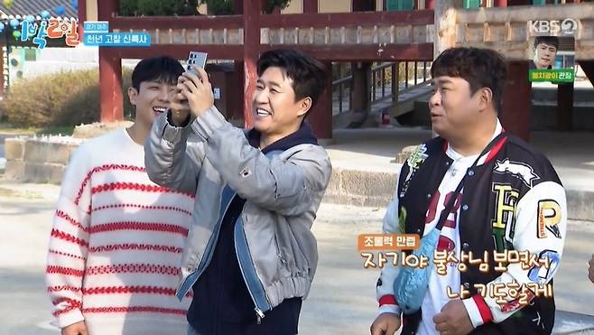 김종민이 사진을 촬영하자 문세윤은 "자기야. 나 여기 왔다? 불상님 보면서 나 기도할게"라며 김종민이 보낼 문자를 예상했고, 딘딘도 "자기랑 결혼하고 첫 촬영이야"라고 밝혔다.