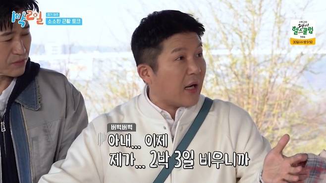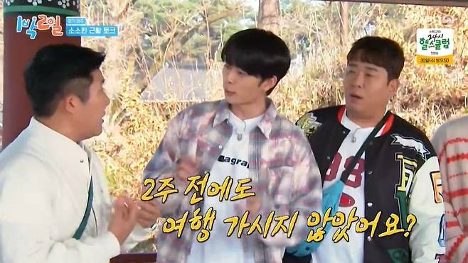 그런 가운데 항상 하루 먼저 촬영지에 오는 조세호는 "어제 오려고 했는데 다 극구 만류하더라"고 밝혔다. 문세윤이 "아내도 이상하게 생각하지 않았냐"고 묻자 조세호는 "친구들과 여행 가 있어서"라고 답했다. 유선호가 "2주 전에도 여행 갔다고 하지 않았냐"고 의아해하자 조세호는 "제가 2박 3일 비우니까 이번에도 그렇게 비울 줄 알고 친구들과 근교에 놀러 갔다. 내가 안 간다니까 당황하더라"고 다급하게 해명하며 "웬만하면 편안하게 시간 보내라고 한다"고 전했다. 유선호가 "우리 형수님이랑 여행을 같이 하는 거네"라고 하자 조세호는 "각자 다른 곳에서 하는 거네"라고 밝혔다.
