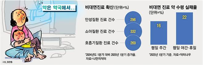 닥터나우에서도 진료를 마친 환자들의 5명 중 1명이 약을 받지 못했다. 특히 평일 주간(16%)보다 평일 야간·휴일(22%)일 때 더욱 높아지는 경향을 보였다. 지난달 닥터나우를 이용했다는 A씨는 “심한 감기에 걸렸는데 생후 2개월된 아기 때문에 나갈 수가 없어 비대면 진료를 받았다”며 “처방전까지 받았는데 약국에 가야 약을 받을 수 있다고 하더라. 결국 약을 못 먹었다”고 말했다.