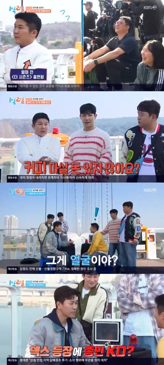 딘딘은 여주 남한강 출렁다리에서 첫 대결을 앞두고 갑자기 제작진에게 커피를 돌린 얘기를 꺼냈다.