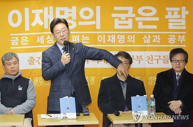 사진은 지난 2017년 8월 '이재명의 굽은 팔' 출판 간담회에서 출간 소감을 밝히던 중 소년공 시절 사고로 굽은 왼쪽 팔을 들어보이고 있는 모습. 2025.4.27 [연합뉴스 자료사진]