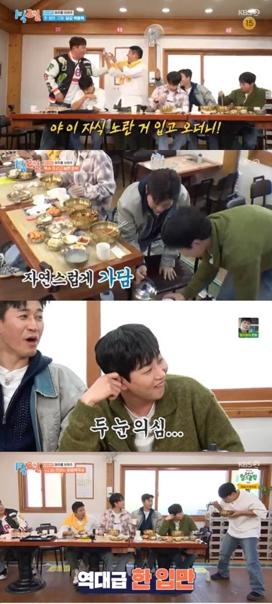 이준, 역대급 한입만 먹방 "막국수 절반을 흡입" (1박 2일)[종합]