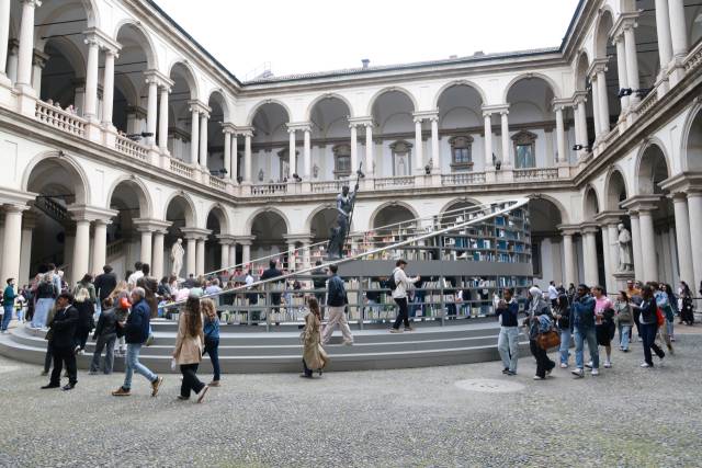 지난 12일, 이탈리아 밀라노의 유서 깊은 브레라궁에 들어서자 중정 광장에 나폴레옹 동상을 가운데 두고 원형 경기장을 사선으로 잘라낸 듯한 모양의 거대한 책장 모양 설치 작품이 시선을 압도했다. 유리 선반은 중정으로 쏟아지는 봄날의 햇살을 반사했고, 알아차리기 힘들 만한 속도로 회전하는 작품 속에서 시민들이 자유롭게 야외 독서를 즐기고 있었다.
