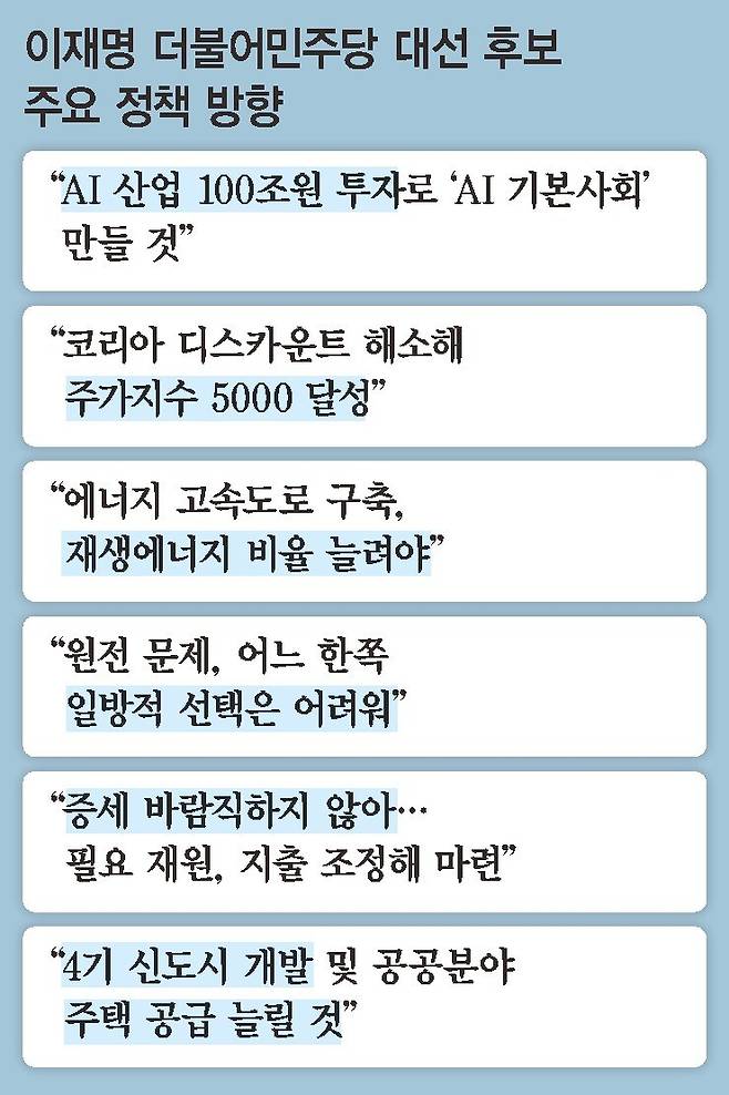 이재명 더불어민주당 대선 후보의 정책 방향은 ‘경제성장을 통한 행복한 삶’(잘사니즘)으로 집약된다. 3년 전 20대 대선 때와 다르지 않다. 다만 3년 전엔 ‘기본소득’을 전면에 내세웠던 것과 달리 이번엔 인공지능(AI)을 활용한 ‘에이아이 기본사회’가 그 자리를 대신하고 있다. 이 후보가 출마 선언 뒤 가장 먼저 발표한 것도 ‘에이아이 투자 100조원 시대’를 열고 국민 모두가 선진국 수준의 에이아이를 무료로 이용할 수 있게 하겠다는 것이었다.