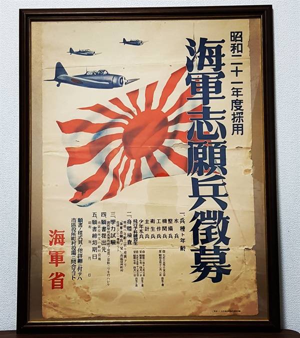 | ▲ 전쟁 말기 해군지원병 모병 포스터 1945년 하반기에 게시될 예정이었던 모병 포스터. 욱일기가 전면에 부각되어있다. 소년수병, 비행예과연습생 등은 13세부터 지원이 가능한 것으로 되어있다. 이러한 선전 포스터들은 전후 소각 처리되었으며, 일본군의 상징물들은 한동안 금기시되었다. |