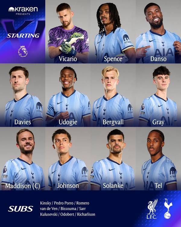 경기 시작을 1시간 15분 앞두고 양 팀 선발 명단이 공개됐다. 토트넘은 4-3-3 전형으로 나섰다. 마티스 텔, 도미닉 솔랑케, 브레넌 존슨이 스리톱으로 출격하고 제임스 매디슨, 아치 그레이, 루카스 베리발이 미드필더진을 이룬다. 데스티니 우도기, 벤 데이비스, 케빈 단조, 제드 스펜스가 수비라인을 구축하고 굴리엘모 비카리오가 골키퍼 장갑을 낀다.