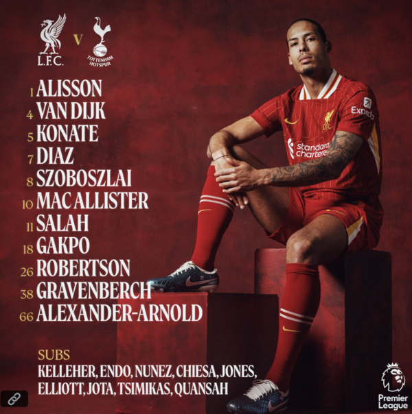 토트넘을 상대하는 리버풀은 주전을 모두 가동했다. 4-2-3-1 전형으로 나선다. 루이스 디아스가 최전방을 책임지고 코디 학포, 소보슬러이 도미니크, 모하메드 살라가 공격을 지원한다. 알렉시스 맥알리스터와 라이언 흐라번베레흐가 중원에 위치하고 앤디 로버트슨, 버질 판다이크, 이브라히마 코나테, 트렌트 알렉산더아놀드가 수비벽을 쌓으며 알리송 베케르가 골문을 지킨다.