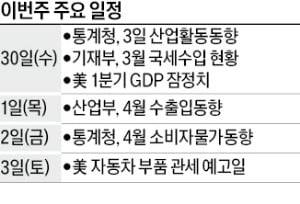해외 지표로는 30일 미국 상무부에서 발표하는 1분기 GDP 증가율 속보치가 중요하다. 경기 침체 수준에 따라 전 세계를 상대로 하는 트럼프 관세 정책 방향이 달라질 수 있어서다. 한국엔 미국이 다음달 3일로 예고한 ‘자동차 부품 관세’를 실제 부과할지가 특히 중요하다. 현지에선 도널드 트럼프 미국 대통령이 자국 자동차산업에 미치는 악영향을 고려해 철강·알루미늄 품목관세(25%)에서 자동차 부품을 제외하는 안을 고려하고 있다는 보도가 나온다