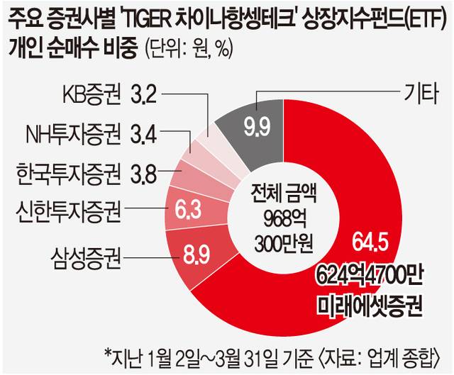 국민일보가 27일 확보한 ‘주요 증권사 창구별 TIGER 차이나항셍테크 개인 순매수 추이’ 자료를 보면 지난 1월 2일부터 3월 31일까지 이 상품의 전체 개인 순매수(매수-매도) 금액 968억300만원 중 624억4700만원어치가 미래에셋증권에서 매수됐다. 전체의 64.5% 수준이다. 이 ETF는 이어 삼성증권 8.9%(86억4100만원), 신한투자증권 6.3%(60억6600만원) 등에서 순매수됐다.