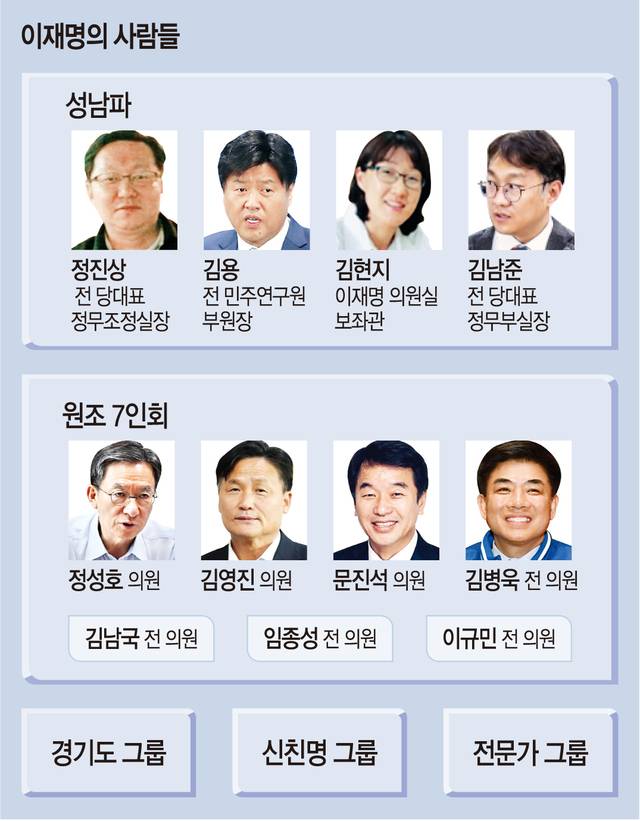 이 후보는 정치 여정을 처음부터 함께한 성남시장 시절 핵심 참모들을 구심점으로, 경기도지사 시절 본격적으로 세력을 확장했다. 원내에서도 오랜 정치적 동지들이 비주류의 설움을 버텨내며 이 후보의 버팀목이 됐다. 이 후보와 함께 본격적으로 중앙 정치 공략에 나선 의원들은 ‘이재명의 민주당’을 완성하며 ‘신(新)친명’으로 분류됐다. 각 단계를 거치며 새로운 인물들이 합류하는 식으로 이 후보 진용은 두터워졌다.