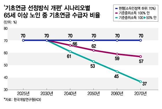 시나리오별로 구체적으로 살펴보면 선정기준액을 기준중위소득 100%로 고정할 경우 수급 대상 규모는 2070년까지 전체 노인의 70%에서 57% 수준으로 점진적으로 준다. 선정기준액을 기준중위소득 100%에서 50%로 조정하는 안에서는 지급대상이 37%까지 축소된다.