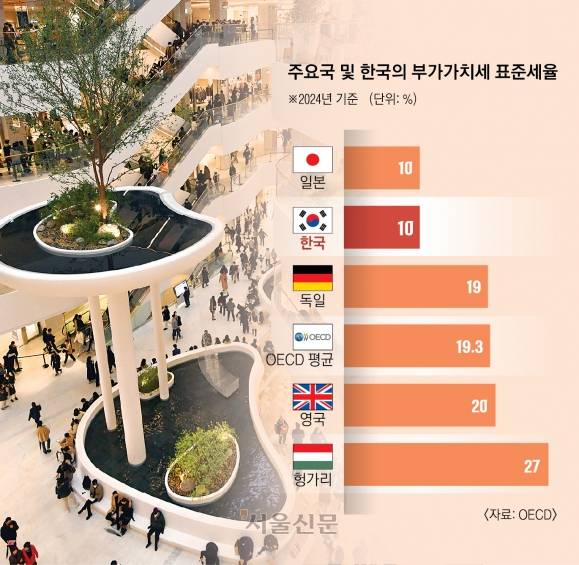 재정적자가 심각하다. 결산 기준 관리재정 수지는 최근 5년간 매년 평균 102조원의 적자를 기록했는데 이는 국내총생산(GDP)의 4%를 상회하는 수준이다. 경제협력개발기구(OECD)는 재정적자가 3%를 넘지 않도록 관리해야 한다고 말한다. 이에 따라 재정적자 해소를 위해 부가가치세를 인상하자는 논의가 나오고 있다. OECD 국가의 평균 부가가치세는 19.3%(2024년 기준)인데 우리는 여전히 10%에 불과하다는 설명도 따라 나온다. 그러나 부가가치세 인상은 서민생활에 악영향을 주니 마지막 카드로 남겨 둬야 한다는 주장도 있다. 부가가치세, 인상해야 할까?