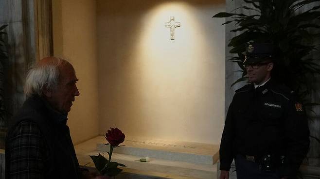 프란치스코 교황 장례 미사 이튿날인 27일(현지시간) 이탈리아 로마 시내 산타 마리아 마조레 대성전(성모 대성전)에 안치된 교황의 무덤이 일반에 처음으로 공개됐습니다.