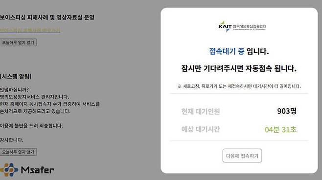 한국정보통신진흥협회(KAIT) 운영 명의도용 방지 서비스 '엠세이퍼' 공식 홈페이지도 접속이 지연됐습니다.