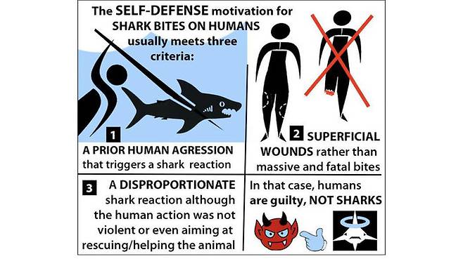 또 상어 공격이 인간의 공격에 대한 반응으로 나왔거나 상어 공격으로 가벼운 표면적 상처만 난 경우, 인간 행동이 폭력적이지 않았거나 구조·구호 목적인데도 상어가 과도하게 반응한 경우 등은 자기방어 행동으로 볼 수 있다며 이런 사고의 책임이 상어가 아니라 사람에게 있다고 설명했습니다.