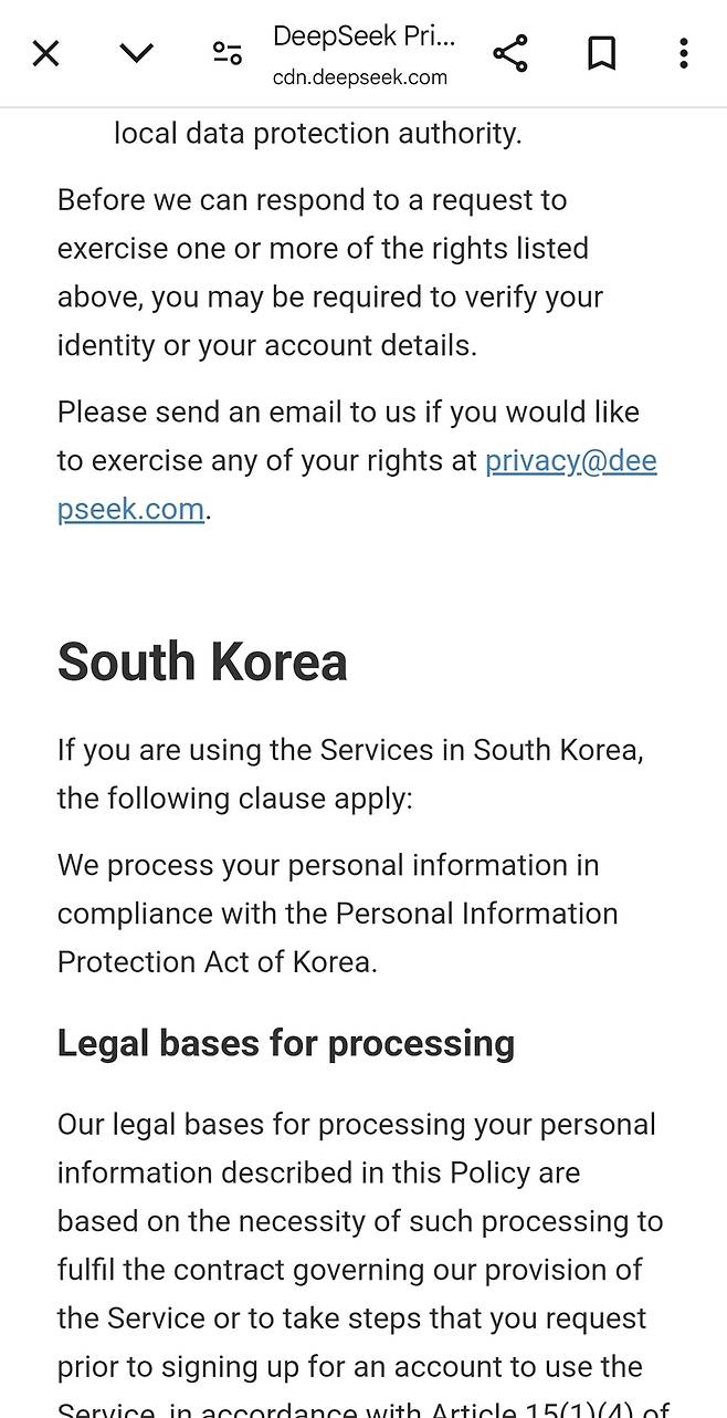 이같은 개인정보위의 지적에 대해 딥시크는 한국어로 된 개인정보 처리방침과 별도의 대한민국 관할조항(처리법적 근거, 보유기간, 파기절차 및 방법, 개인정보 보호책임자 등)을 추가해 지난 3월 말 제출했습니다.