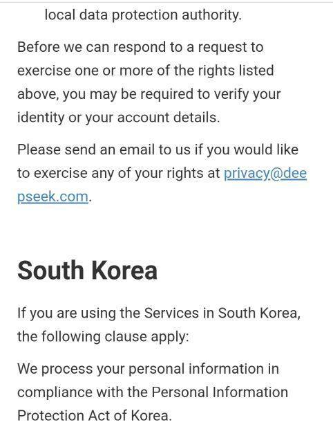 딥시크가 오늘 업데이트한 개인정보 처리 방침에 따르면 개인정보 처리 방침에 한국 항목을 추가하면서 "한국에서 서비스를 이용하는 경우 이 조항을 적용받는다"라면서 "한국의 개인정보보호법을 준수해 이용자의 개인정보를 처리한다"라는 내용을 담았습니다.
