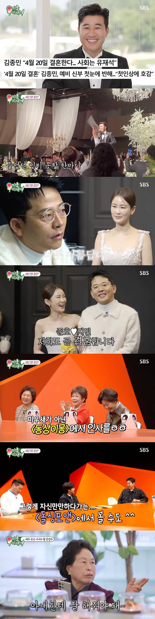 또한 김종민의 아내에 대해서는 "착하고 남편밖에 모른다. 아내한테 잘해줘야 된다. 조금만 잘 못해주면 굉장히 슬퍼한다"라며 누구보다 아내를 먼저 챙기라고 당부해 눈길을 끌었다.