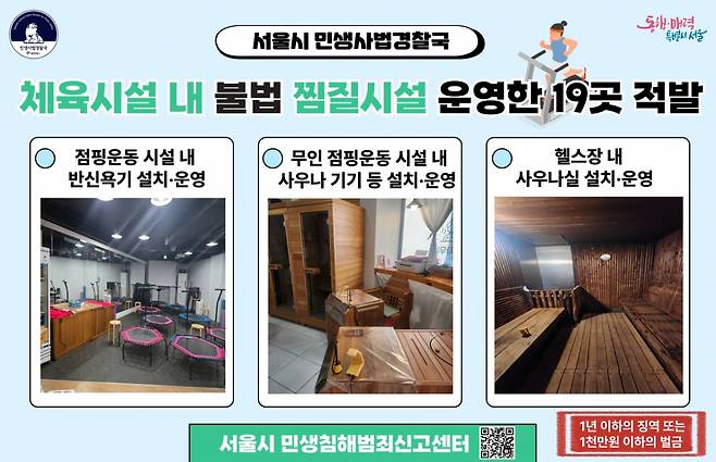 서울시 민생사법경찰국은 목욕장업 영업 신고 없이 반신욕기 등을 설치하고 찜질 시설을 불법으로 운영한 체육시설 19곳을 적발했다고 28일 밝혔다.