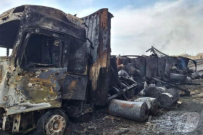 (샤히드라자이 AFP=뉴스1) 우동명 기자 = 27일(현지시간) 이란 남동부 반다르압바스 지역 샤히드라자이 항구에서 폭발 사고가 발생해 최소 40명이 숨진 현장서 불에 탄 차량이 보인다. 2025.04.28