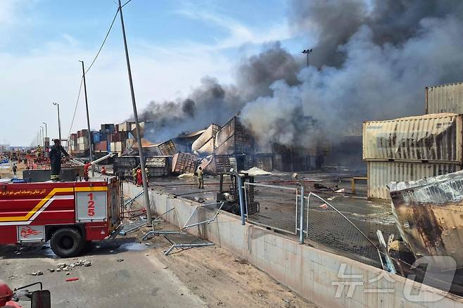 (샤히드라자이 AFP=뉴스1) 우동명 기자 = 27일(현지시간) 이란 남동부 반다르압바스 지역 샤히드라자이 항구에서 폭발 사고가 발생해 최소 40명이 숨진 현장이 연기로 덮여 있다. 2025.04.28