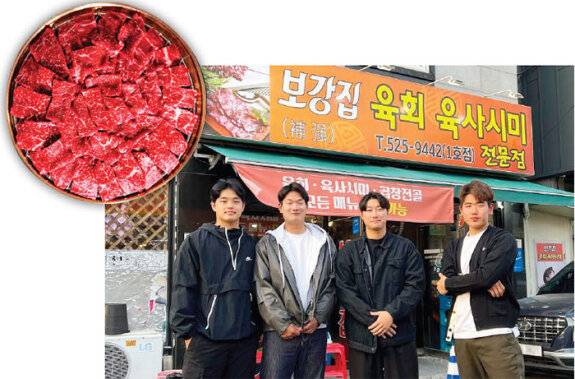 생고기 전문점 보강집은 대전에서 성심당만큼 유명한 맛집이다. 대전에만 유천동 본점을 포함해 지점 4곳이 있고, 근처 세종과 천안으로도 영역을 확장했다. 이곳은 한화 이글스 야구 중계를 볼 수 있는 것은 물론, 운이 좋으면 선수들과 '자만추(자연스러운 만남 추구)’ 할 수 있는 장소로도 유명하다. 경기 후 늦은 저녁을 먹으러 오는 선수들과 마주쳤다는 후기를 심심찮게 볼 수 있다. 보강집 관계자가 알려준, 선수들이 즐겨 먹는 메뉴는 운동 후 단백질을 보충하기 좋은 뭉티기와 육사시미다. 둘은 도축 시간과 식감이 다르다. 도축한 지 24시간 이내의 뭉티기는 쫄깃하게 씹는 맛이 더 있으며, 당일 도축이라 주말에는 팔지 않는다. 육사시미는 도축한 지 24시간이 지나 뭉티기보다 부드러우면서 쫀득하다. 노시환 선수의 추천 픽 곱창전골과 문동주 선수 픽 육회비빔밥도 별미다.