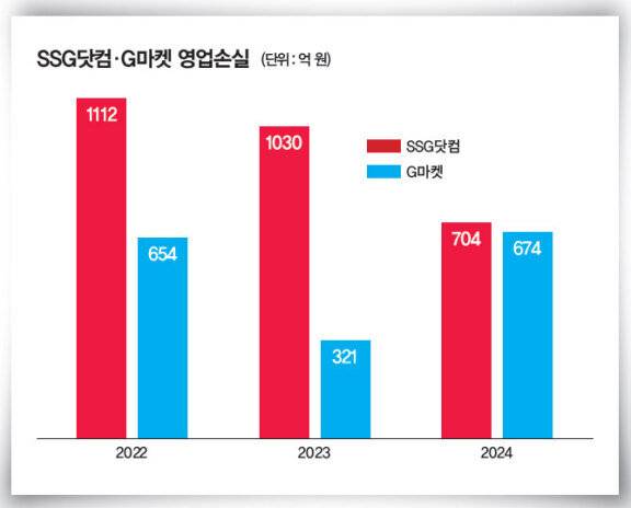소기의 성과를 거두고 있는 정 회장의 아킬레스건은 온라인 시장이다. 지난해 SSG닷컴은 704억 원, G마켓은 674억 원 영업손실을 기록했다(그래프 참조).쿠팡을 비롯한 이커머스 시장의 약진에 신세계그룹은 2018년 이마트몰과 신세계몰을 합쳐 SSG닷컴을 출범했으나 지난해까지 총 5000억 원대 적자를 냈다. 지난해 조정 상각전 영업이익(EBITDA) 기준 50억 원 흑자를 처음 달성하긴 했지만 2021년 이후 목표로 한 상장까지는 시간이 걸릴 전망이다. 2023년 론칭한 신세계그룹 통합 멤버십 '신세계 유니버스 클럽'도 이렇다할 반응을 이끌어내지 못하고 있다.