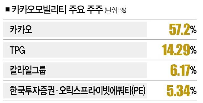금융감독원에 따르면, 지난해 말 기준 카카오모빌리티의 최대주주는 지분 57.2%를 보유한 카카오다. 2대 주주는 미국 사모펀드 운용사 'TPG'의 컨소시엄 '카키홀딩스'로 14.29%의 지분을 보유하고 있다. 이런 상황에서 국내 사모펀드 VIG파트너스가 "카카오모빌리티의 지분을 인수하겠다"고 나서면서 매각설에 불이 붙었다. VIG파트너스는 카카오모빌리티의 주주 중 한곳인 TPG의 지분 인수를 추진하고 있다.