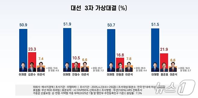 국민의힘 지지율 1위 주자인 김문수 후보와의 3자 대결에서 이재명 후보는 50.9%의 지지율을 기록했다. 김 후보는 국민의힘 후보 중 가장 높은 23.3%, 이준석 후보는 7.4%로 나타났다.