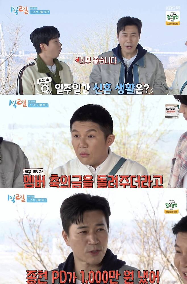 딘딘은 "일주일 동안 어땠냐"고 물었고 김종민은 "너무 좋다. 막 안고 있고"라며 너스레를 떨었다. 조세호는 "형이 너무 멋있는 게 멤버 축의금을 돌려주더라"라고 눙쳤다. 김종민은 "('1박2일') 종현PD가 1000만원 정도 냈다"고 받아쳐 주종현PD를 당황하게 했다.