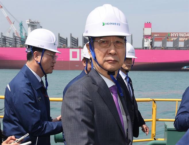 | ▲ 한덕수 대통령 권한대행 국무총리가 지난 16일 HD현대중공업 울산 조선소에서 다산정약용함을 살펴보고 초계함으로 이동하고 있다. |