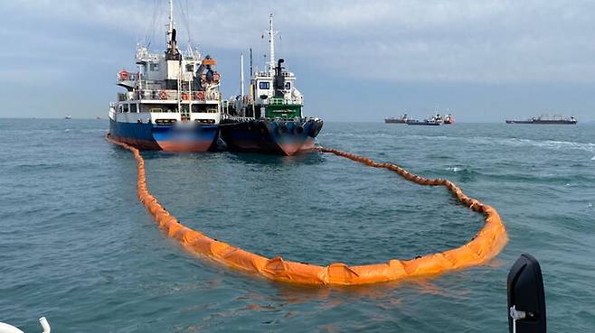 외국 화물선(1천400t급)이 급유선(200t급)으로부터 기름을 받던 중 저유황 벙커B유가 유출된 것으로 조사됐습니다.