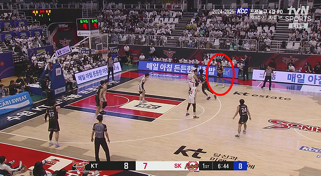 KT의 공격 상황. 하프코트 오펜스에서 공을 잡지 않고 림 근처까지 내려온 허훈은 해먼즈의 다운 스크린을 받아 수비수를 벗겨낸 뒤 공을 잡기 위해 탑으로 올라온다.