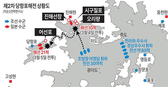 제2차 당항포해전은 임진왜란 강화협상 시기인 1594년 음력 3월 3일 적선 31척이 부산포 방면에서 진해현과 고성현 일대로 침입해 오자, 한산도에 있던 이순신 장군이 속칭 괭이바다 일대를 봉쇄하고 어영담을 인솔장수로 지명해 읍전포에서 적선 6척, 시구질포에서 2척, 어선포에서 2척, 당항포에서 21척을 격파한 전투이다.