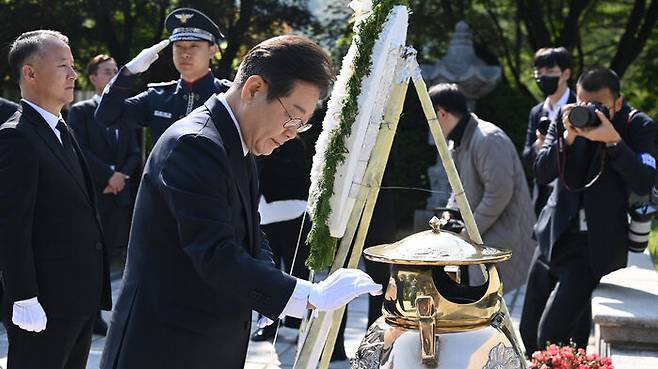 ▲ 더불어민주당 이재명 대선 후보가 28일 동작구 국립서울현충원 고 이승만 전 대통령 묘역을 찾아 참배하고 있다.