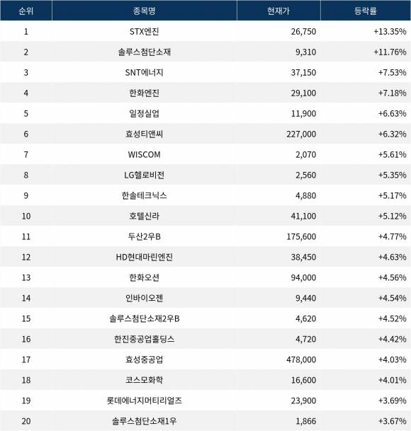 이어 상승률 2위 솔루스첨단소재(336370)는 현재가 9,310원으로 주가가 11.76% 급등하고 있다. 상승률 3위 SNT에너지(100840)는 현재 37,150원으로 7.53% 상승하며 강세를 보이고 있다. 상승률 4위 한화엔진(082740)은 7.18% 상승하며 29,100원에 거래되고 있다. 상승률 5위 일정실업(008500)은 6.63%의 상승세를 타고 11,900원에 거래되고 있다.