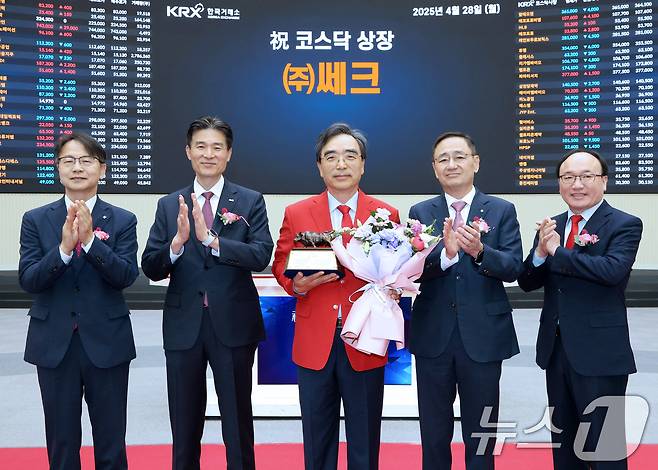 (서울=뉴스1) = 28일 서울 영등포구 한국거래소에서 열린 쎄크 코스닥시장 상장 기념식에서 김대영 한국IR협의회 부회장(왼쪽부터), 민경욱 한국거래소 코스닥시장본부장, 김종현 쎄크 대표이사, 금정호 신영증권 사장, 강왕락 코스닥협회 부회장이 기념 촬영을 하고 있다. (한국거래소 제공. 재판매 및 DB 금지) 2025.4.28/뉴스1