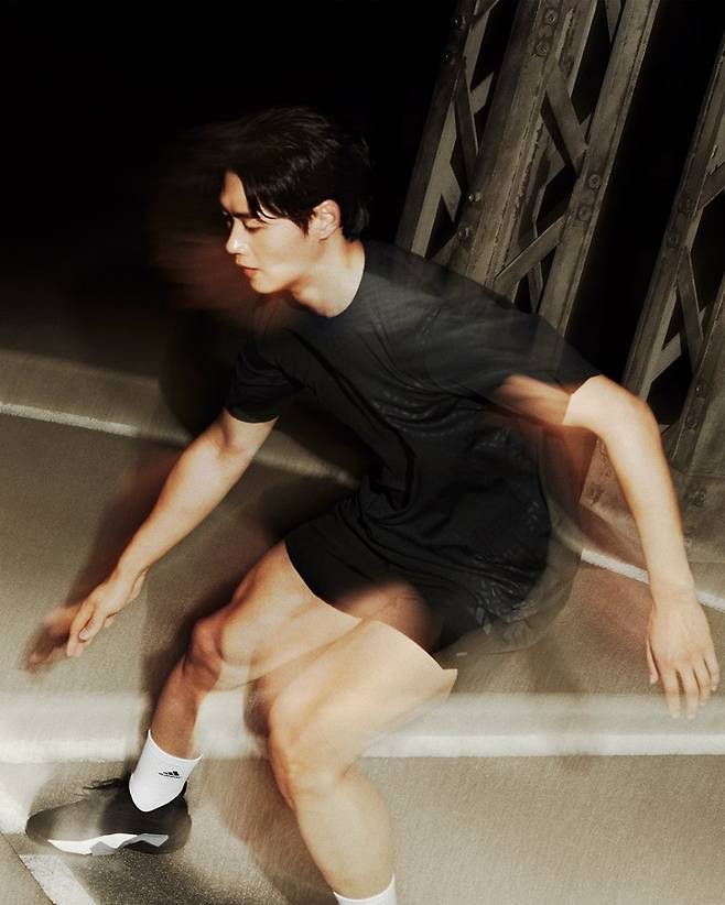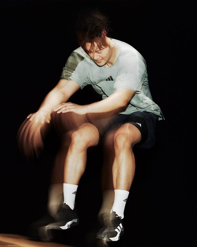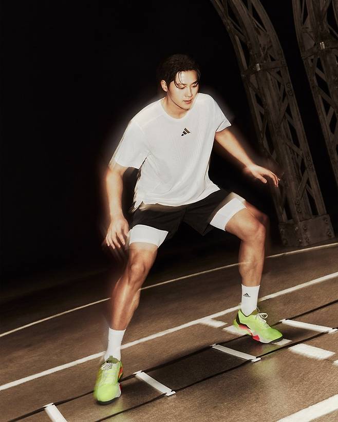 오상욱은 슬림 핏 클라이마쿨 의류와 초경량 트레이닝화 '래피드무브 ADV 2'를 매치해 완성도 높은 트레이닝 룩을 선보였다.