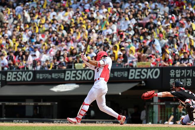 LG가 3회 초에 동점 반격했다. 홍창기 볼넷, 문보경 안타로 1사 1, 3루 찬스가 만들어졌고 김현수의 좌전 적시타가 터지며 1-1 동점이 됐다. KIA는 4회 말 최형우가 140km 직구를 통타해 비거리 115m 우측 담장 넘기는 솔로포를 터뜨리며 리드점수를 만들었다. 시즌 4호 홈런이다. 이후 1사에서 변우혁 2루타가 터졌지만 범타로 이닝이 닫혔다.