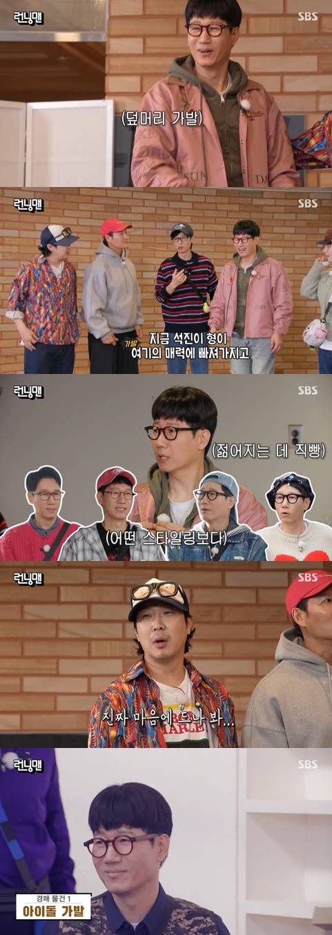 지난 '런닝 상인회'에서 경매 물건이었던 덮머리 가발을 착용하고 등장한 지석진은 "약속을 지켰습니다"라며 풍성한 머리카락을 자랑했다. 이를 본 유재석은 "석진이 형이 여기 매력에 빠졌다"라고 말했다.